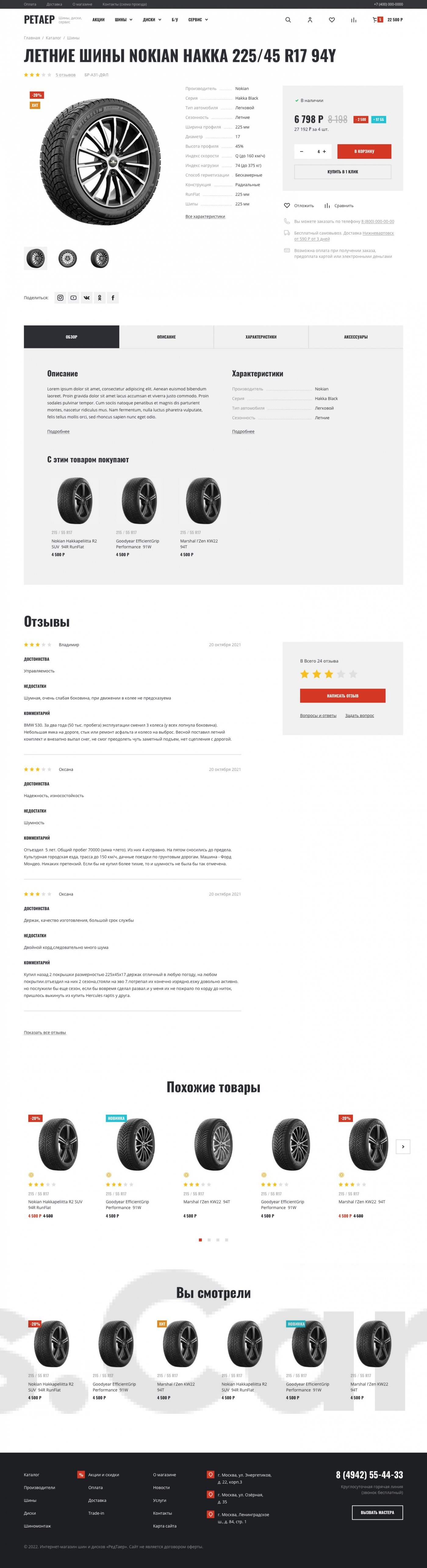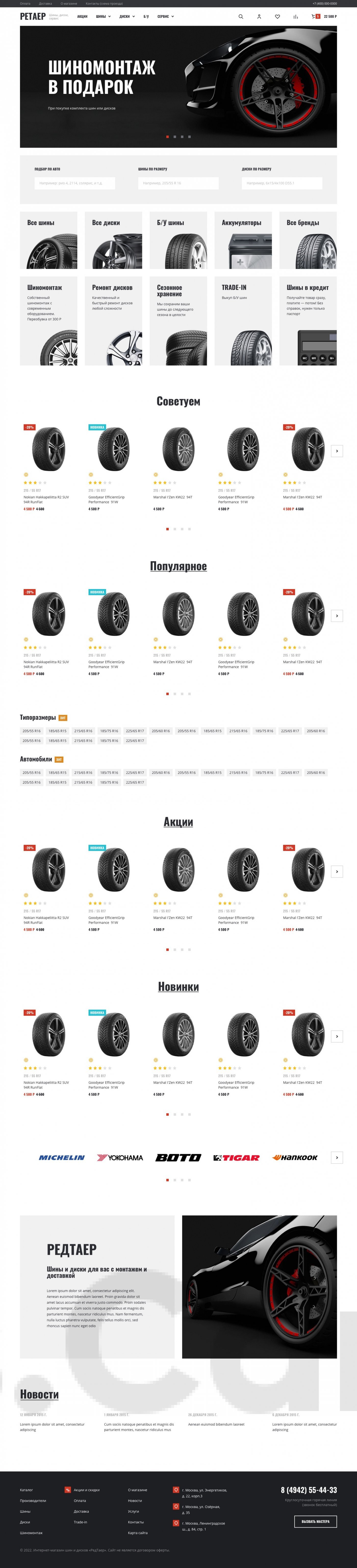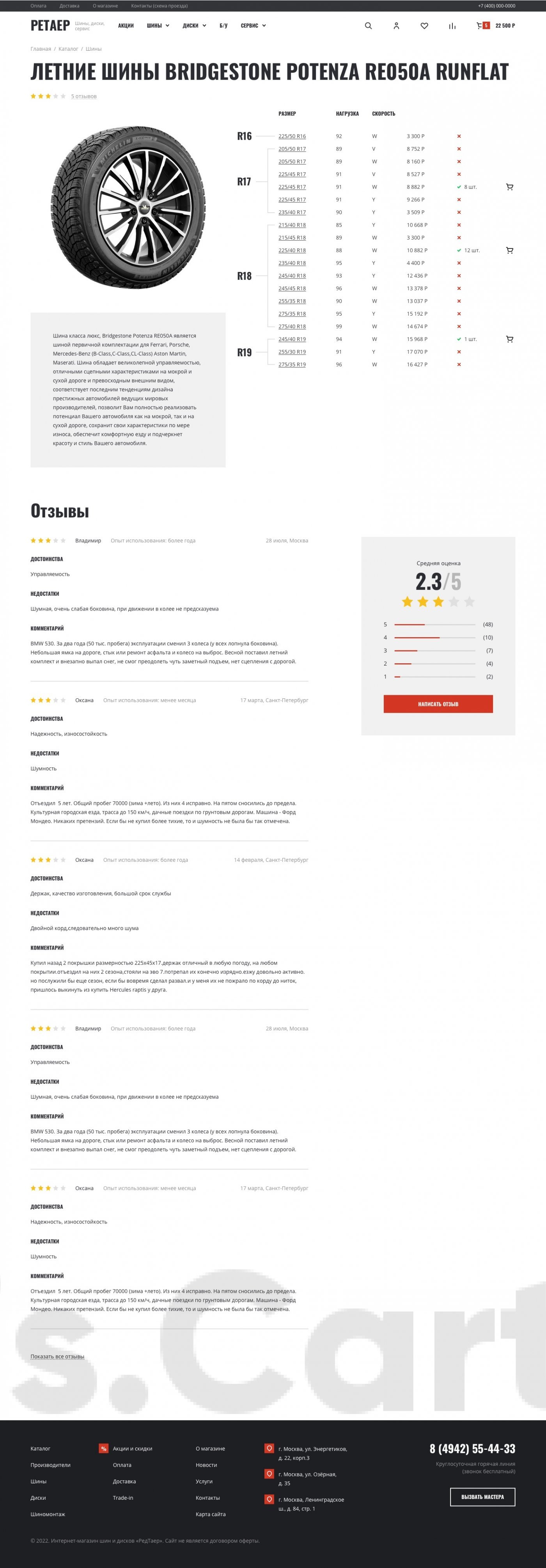 Решение для магазина шин и дисков. Все продумано: все товары удобно выводятся на главной странице, а подробную информацию можно увидеть во всплывающем окне, прямо на списке можно выбрать опции товара (например, размер или вид теста Товары можно помечать любыми метками для удобства пользователей.