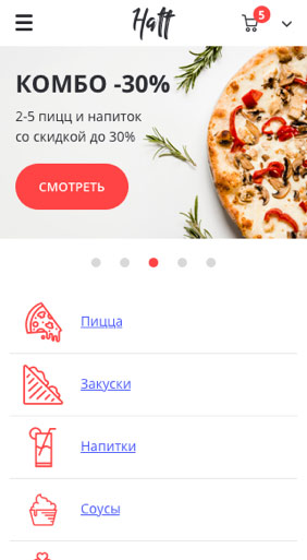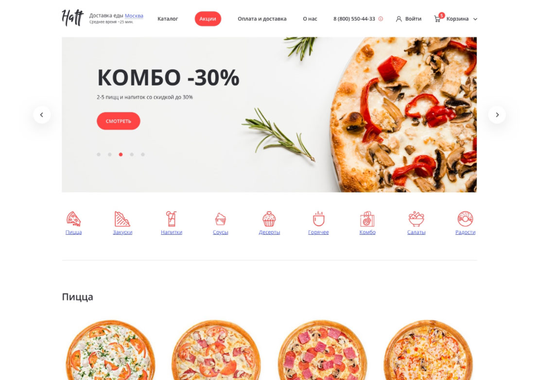 Решение для сервиса доставки готовой еды (пицца, бургеров, суши и роллы, обеды). Все продумано: все товары удобно выводятся на главной странице, а подробную информацию можно увидеть во всплывающем окне, прямо на списке можно выбрать опции товара (например, размер или вид теста Товары можно помечать любыми метками для удобства пользователей.
